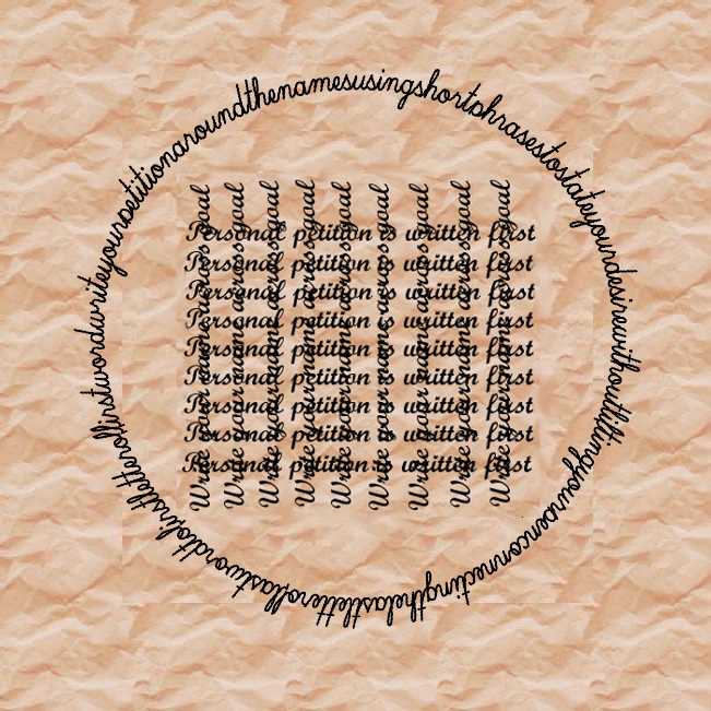Next, I have constructed a personal petition paper that has the goal written out first an odd number of times (3, 7, or 9 are the numbers I will use). Turn the paper and write out your full name across the petition the same number of times directly on top of the petition words. This is called “covering and crossing”. Now the last thing you CAN do, but not everyone does, is write out a short phrase such as “successfulbusinesssuccessfulbusiness” that is the main idea of the intent around the words in a complete circle without lifting the pen for spaces or dotting i’s and crossing t’s. Connect the last letter of the last word to the first letter of the first word. Then go back to dot i’s and cross t’s. Additionally, but not mandatory, is to draw symbols in the 4 corners of the petition paper.